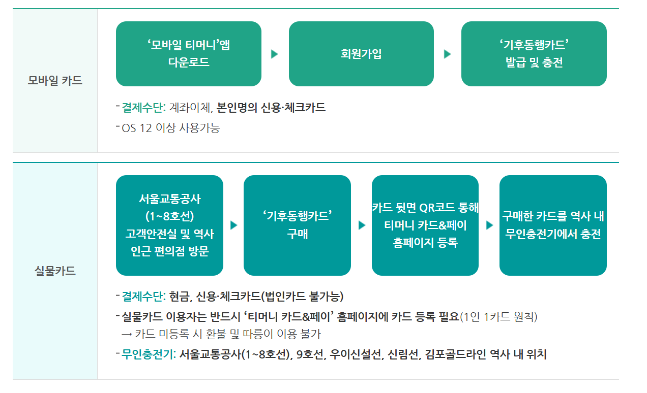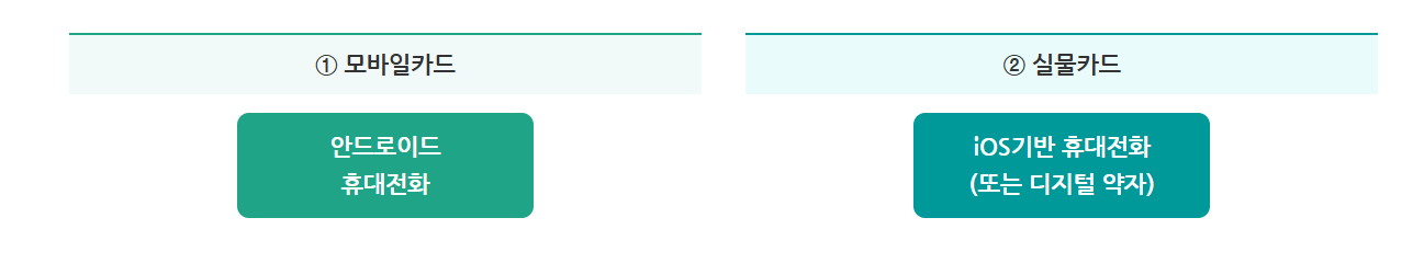 | 아이폰 or 디지털 약자 | 실물 카드 | 역사 고객안전실/편의점 구매 → 홈페이지 등록 → 무인충전기 충전 |