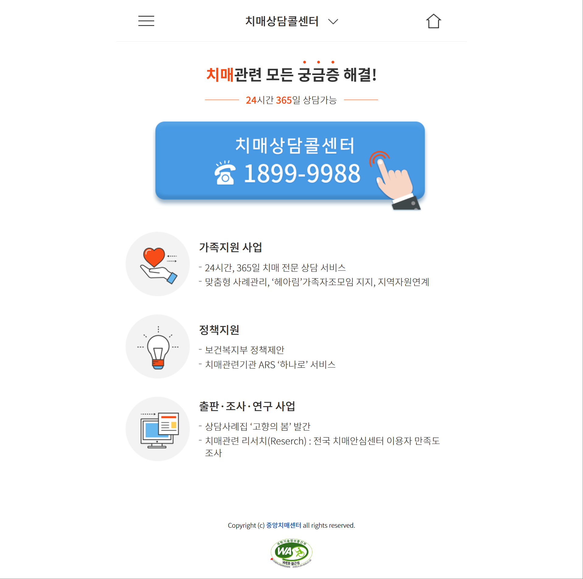 치매 예방, 치료, 보호, 가족 심리상담까지 전화를 통해 편하게 상담받을 수 있는 전국민 대상 치매 전문 플랫폼입니다.